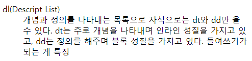 사전에 들어가는 형식에 잘 맞는다고 해야하나. 다 만드는 사람의 뜻이겠지만 내가 해석한 사전에 들어가는 개념과 정의를 설명하는 목록이라고 이해를 했다. 글에도 쓰여 있지만 dl에서는 자식으로 dt와 dd만을 사용할 수 있다. dt는 인라인 dd는 블록성질