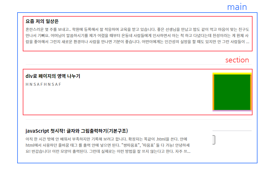 main section article 이 세가지가 구별하기가 어려운데 메인은 말그대로 메인 화면이고, 섹션은 메인 안으로 들어가는 태그이며 여러개의 글을 묶는다. 아티클은 지금 보는 이 글 하나를 의미한다. 그림으로 확인해보자