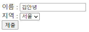 이름과 지역을 선택하고 제출을 눌렀을 때 경고창(alert)에 이름과 지역번호가 뜨게 만드는 코드이다.