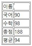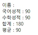 그리고 순서대로 이름, 국어, 수학, 합계, 평균을 출력한다.