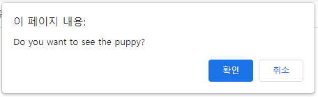 alert는 말 그대로 주의사항을 팝업창을 띄워서 안내하는 역할을 합니다. 그래서 확인 버튼 말고는 기능이 없어요. 바로 나가지 않는 다면 꼼짝 없이 그림(귀여운 강아지 사진)을 봐야 합니다.