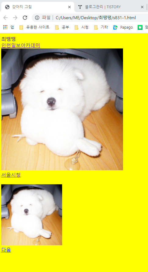 첫번째 강아지 그림은 그저 사진일 뿐이다. 하지만 두 번째 사진의 코드를 잘 보면 '하이퍼링크 이미지'이다. 그말인즉슨 누르면 다른 사이트로 이동을 한다. 인천시청 도메인을 넣어놨다. 하이퍼링크 이미지도 텍스트와 마찬가지로 <a> 태그를 이용한다. 그리고 안에 <img src=""> 태그로 이미지를 넣어준다. <a href=""><img src=""></img></a> 이런식이다.