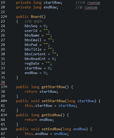 RNUM에서 사용할 페이징 시작번호와 끝번호의 인스턴스 변수 정의함. (getter/setter)