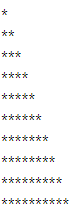i는 1부터 10까지 실행이 되고, j는 i의 숫자 만큼 실행이 됩니다. 그래서 1열에는 1행까지만 2열에는 2열까지 순차적으로 늘어나는데요. 그 숫자 만큼 별(*)이 출력 되는 과정입니다.
