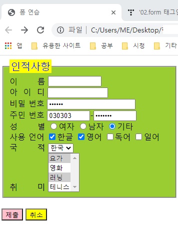 태그를 이용해서 만든 페이지. 주로 회원가입 할 때 입력하는 회원정보 페이지 라고 할 수 있다. 아직 데이터베이스에 저장하는 기능은 없다. 그 말인즉슨 내가 무엇을 입력하고 선택했는지 컴퓨터는 알 길이 없다. 이 때 필요한 게 자바스크립트나 제이쿼리 등과 같은 언어인데 지금은 프론트엔드쪽만 배우기 때문에 이정도로 만족해야한다.