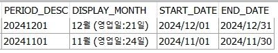 - 따라서 해당 쿼리는 시작 월만 입력받아 이번달 말일과 지난달, 지난달 말일을 출력 할 수 있는 쿼리이다. 영업일의 경우 대체 공휴일 등이 있기 때문에 수기로 입력 받아야만 함