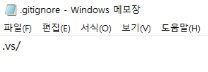 .gitignore 파일에 .vs만 추가하면 됨. 저 에러가 떴을 땐 .gitgnore 파일이 없었기 때문에 루트 디렉토리에 추가만 해주면 되는 상황이었고, 그냥 메모장 하나 켜서 추가하면 끝난다. 저장할 땐 파일명 없이 .gitgnore만 입력. 그리고 다시 스테이징 작업 해주면 정상적으로 처리 되는 걸 확인할 수 있음