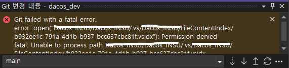 .vs/ 디렉토리(Visual Studio 설정 파일 포함)의 특정 파일에 읽기 권한이 없어 Git이 해당 파일을 처리하지 못하는 상황이다.