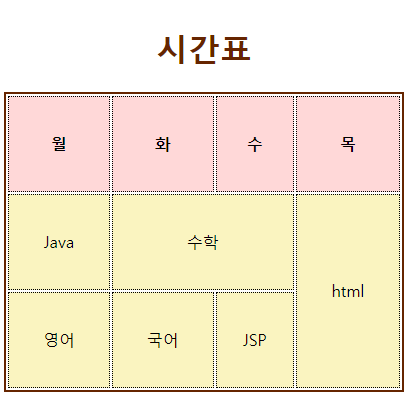<td>Java</td> <td colspan="2">수학</td> <td rowspan="2">html</td>