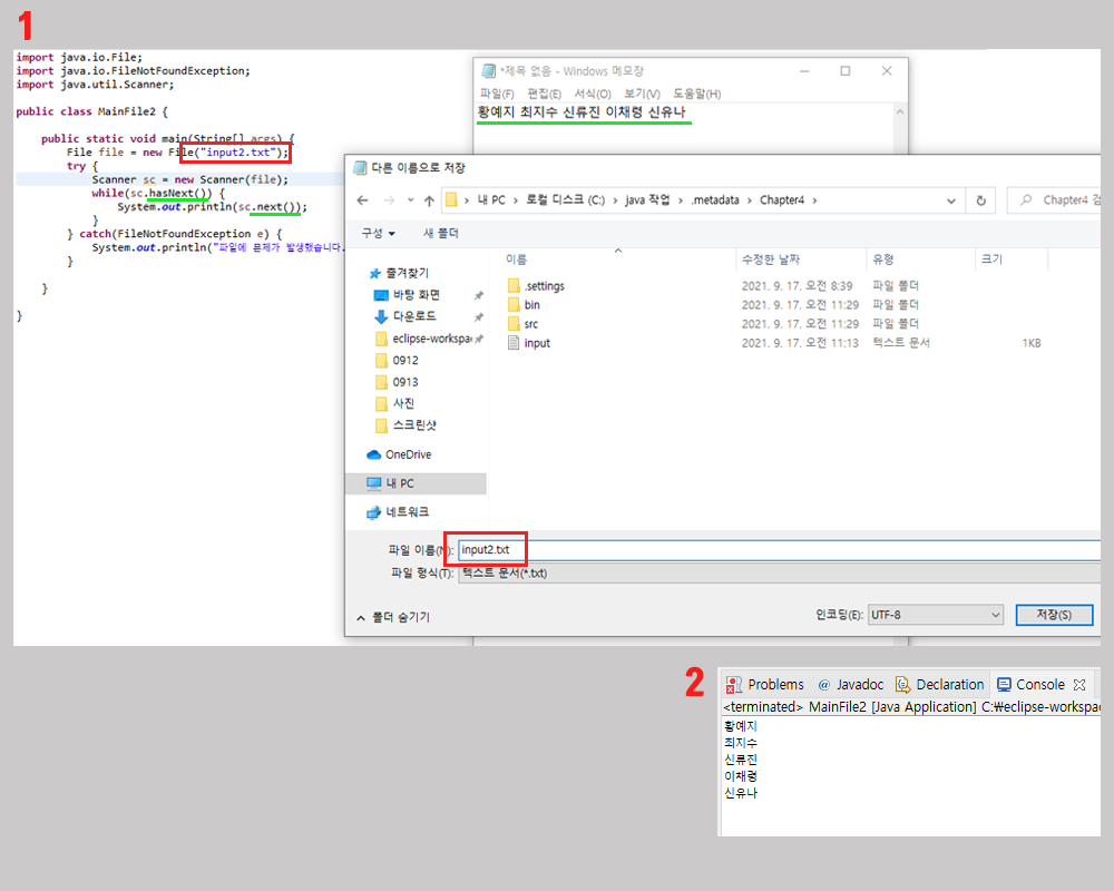 여기서 FileNotFoundException e 이 부분은 파일을 찾을 수 없는 예외를 말하는 상황!