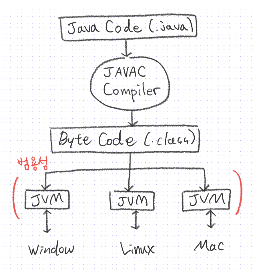 자바 소스코드로 작성한 것을 기계가 읽을 수 있도록 컴파일러(javac)가 바이트코드로 변환한다. 이 때 확장자가 .class이다. 바이트코드 라는 것은 JVM(가상머신)이 이해할 수 있는 언어로 어떠한 플랫폼에서도 JVM 위에서 실행할 수 있다. (Window, Linux, MAC 어디서든 사용 가능)