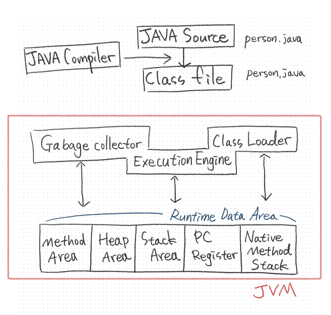 다시 그림을 보면서 위에 했던 말을 반복하자면.. 자바 소스를 만들면 자바 컴파일러(javac)가 클래스 파일로 바꿔준다. 이 클래스 파일을 컴파일 시키면 JVM으로 간다. 그 안에서는 무슨 일이 벌어지고 있을까? 클래스로더가 그것을 가지고 와서 연결을 시킨다. 그것을 익스큐션 엔진이 실행을 시켜준다. 가비지 컬렉터는 말 그대로 메모리 관리를 자동으로 해주는 부분이다. 런타임 데이터 지역은 기억저장소라고 할 수 있다.