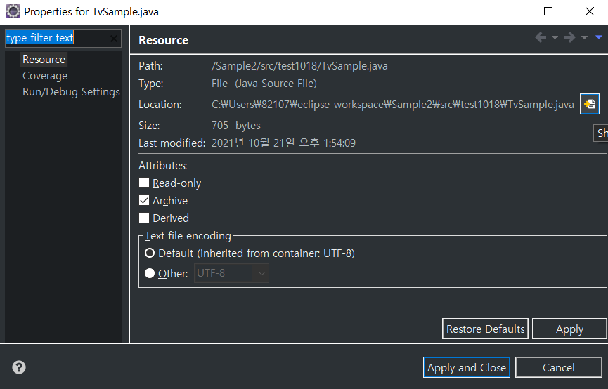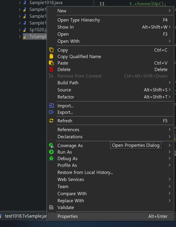 해당 자바 파일 오른쪽 클릭 - properties(Alt + Enter)