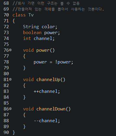 이것은 Tv 클래스로 다양한 기능(메소드)들이 들어있다.